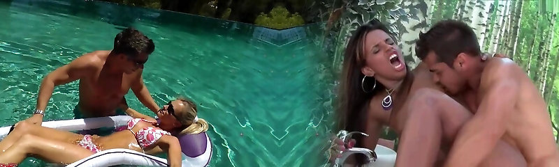 Two kinky bitches lovin’ two hard cocks on the swimming pool