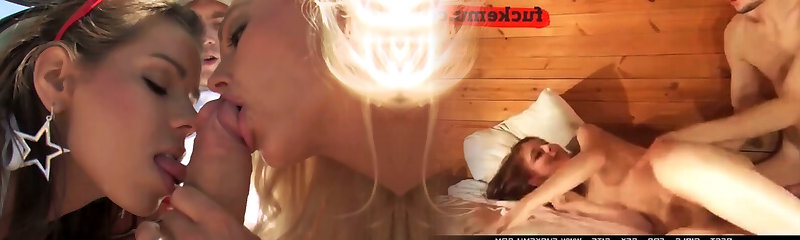 Two astonishing breezies deepthroat one hard dick and get banged with it