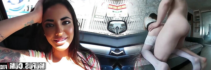 Round ass brunette stretches her legs to ride a stiffy in the van