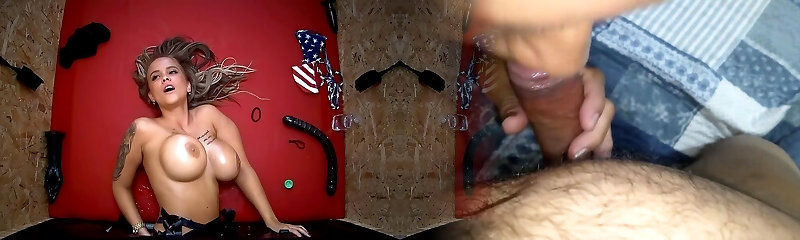 Depraved ginormous breasted tattooed slut Kerry Louise sucks glory-hole device