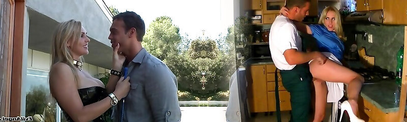 Busty blonde Nicolette Shea rides a dudr while his wifey sees