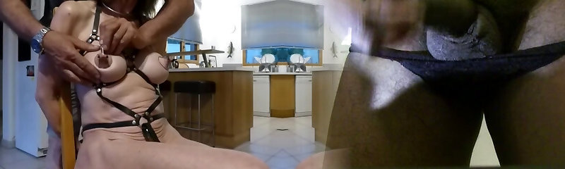 slave equipped with harness and bondage string is pierced