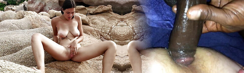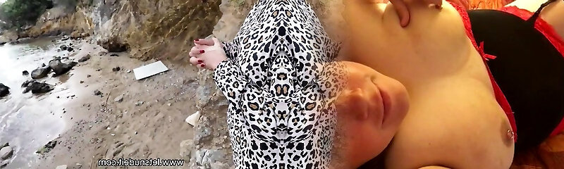 Big boobs woman playing with man rod on nude beach
