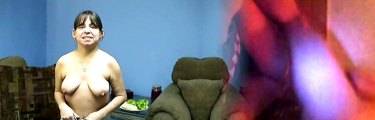 Gross chubby MILF with saggy orbs masturbates with pepper and corn cob