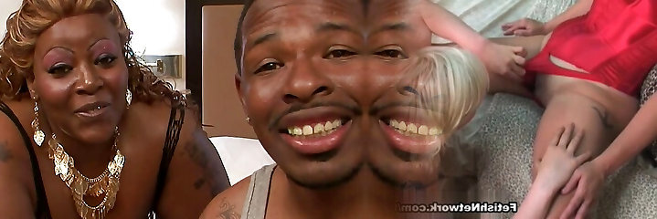 Ugly busty ebony slobbers on two dark-hued shafts
