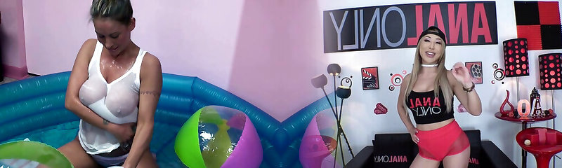 Hideous brunette MILF with gross fake boobs masturbates in inflatable pool